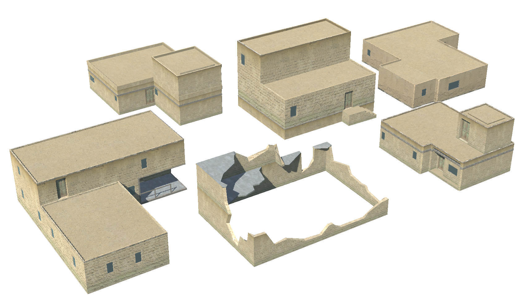 A set of simple, textured middle-east desert-themed buildings, walls, and accessories. Available as a .zip containing .blends and .fbx files, or a Unity package.